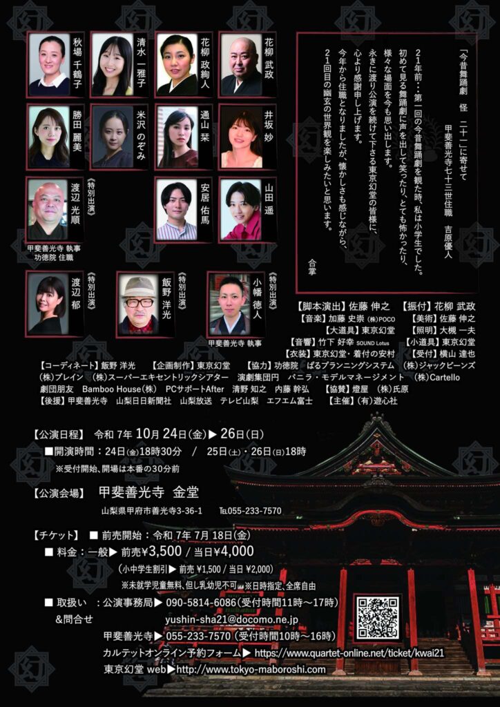 毎年、東京幻堂は善光寺で「今昔舞踊劇 ― 怪」という舞踊パフォーマンスを上演しています。