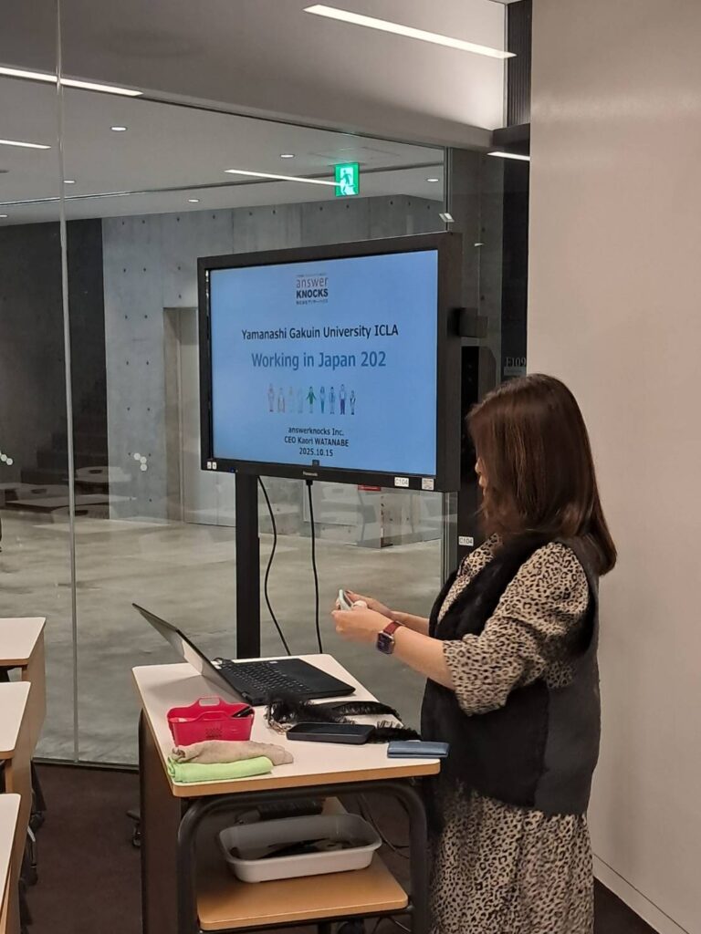 On that day, Kaori gave a lecture at Yamanashi Gakuin University’s ICLA for international students that are interested in joining the Japanese workforce.